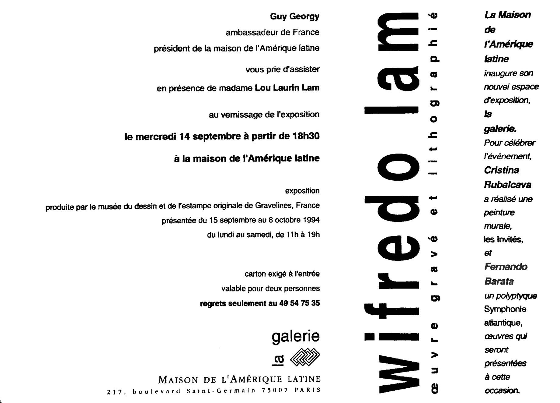 A exposição itinerante estreou na Maison de L’ Amérique Latine (Paris) e percorreu diversos países do Caribe e da América Latina, com obras de artistas latino-americanos e caribenhos residentes na França, como Wilfredo Lam, Roberto Matta, Jésus Soto, Julio Le Parc, Pat Andrea, Arthur Piza e outros.